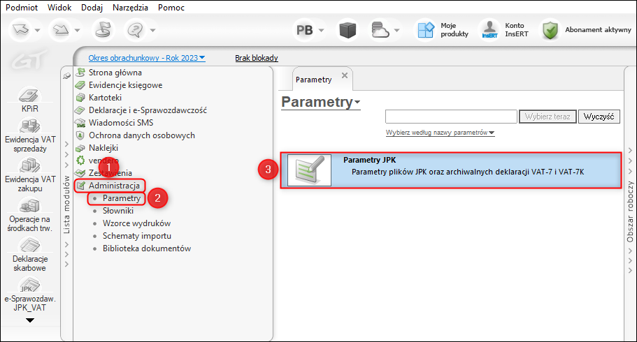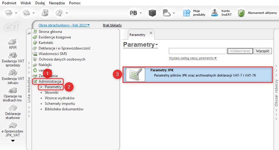 1. Z listy modułów wybrać Administracja – Parametry, a następnie odnaleźć i uruchomić Parametry JPK.