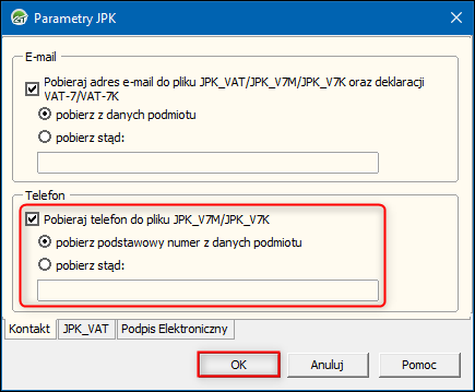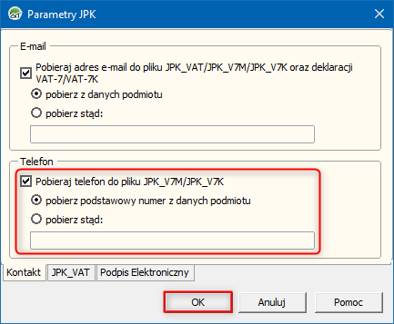 2. W oknie Parametry JPK zaznaczyć Pobieraj telefon do pliku JPK_V7M/JPK_V7K. Po zaznaczeniu uaktywnione zostaną dwie opcje: pobierz podstawowy numer z danych podmiotu lub pobierz stąd. Po zaznaczeniu opcji pobierz stąd, w polu poniżej należy wpisać adres e-mail, który ma się pojawiać na pliku JPK. Aby zapisać zmiany, należy kliknąć przycisk OK.