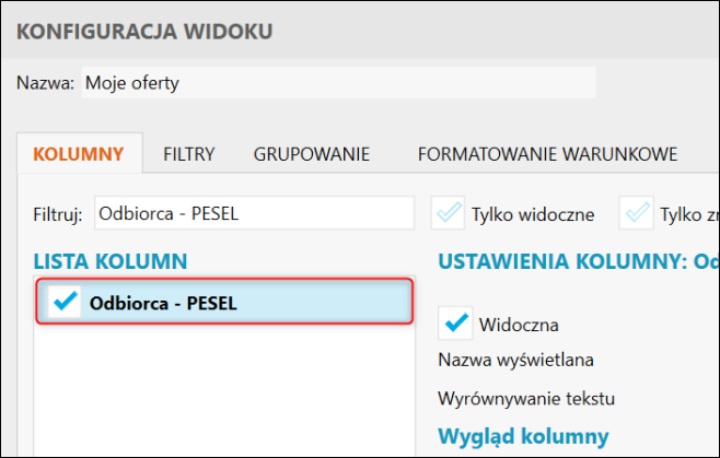 Gestor nexo – Jak do widoku Ofert dodać kolumnę Odbiorca – PESEL?