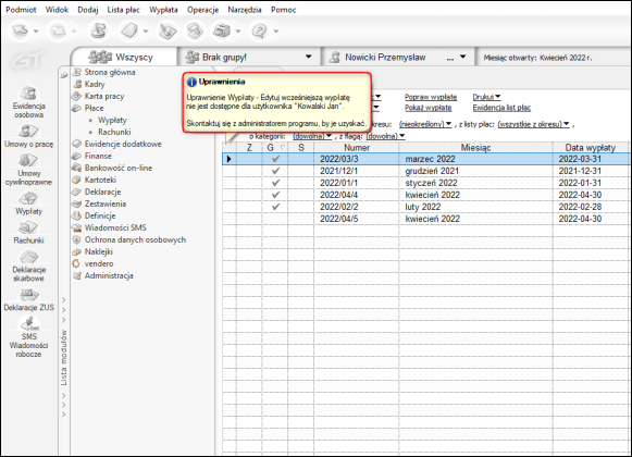 Rezultatem odebrania uprawnień będzie blokada możliwości edytowania wcześniejszych wypłat potwierdzona odpowiednim komunikatem.