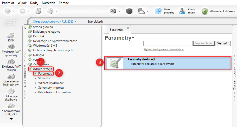 1. Z listy modułów wybrać AdministracjaParametry, a z listy parametrów Parametry deklaracji.