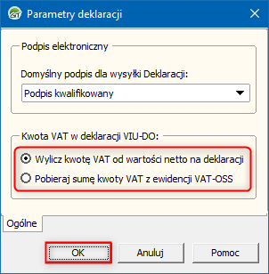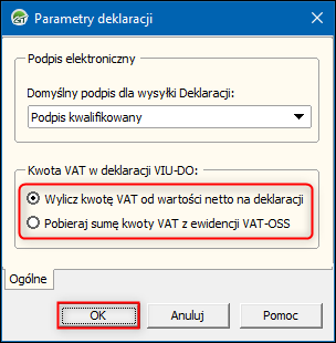 2. W oknie, które się wyświetli wybrać w sekcji Kwota VAT w deklaracji VIU-DO jedną z dwóch opcji: