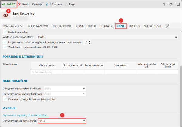 2. Na zakładce Inne wskazać Domyślny sposób szyfrowania: PESEL. Zatwierdzić przyciskiem Zapisz.