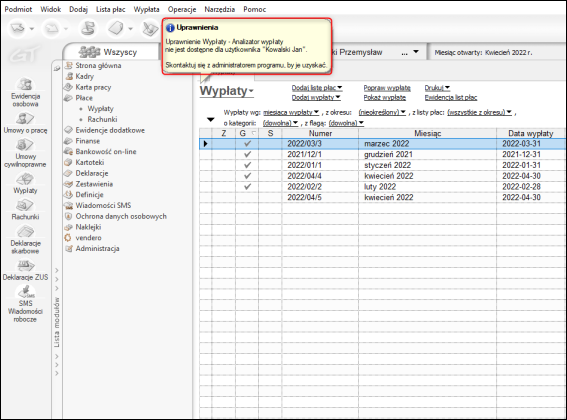 Rezultatem odebrania uprawnień będzie blokada dostępu do analizatora wypłaty potwierdzona odpowiednim komunikatem.