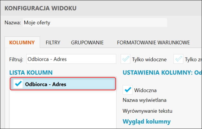 Gestor nexo – Jak do widoku Ofert dodać kolumnę Odbiorca – Adres?