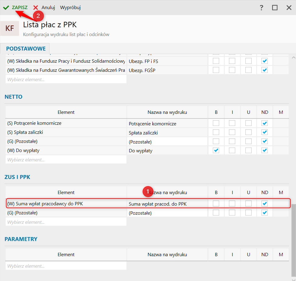 3. W dolnej sekcji formularza w sekcji Parametry dodać Element: (W) Suma wpłat pracodawcy ​do PPK. Zapisać zmiany.