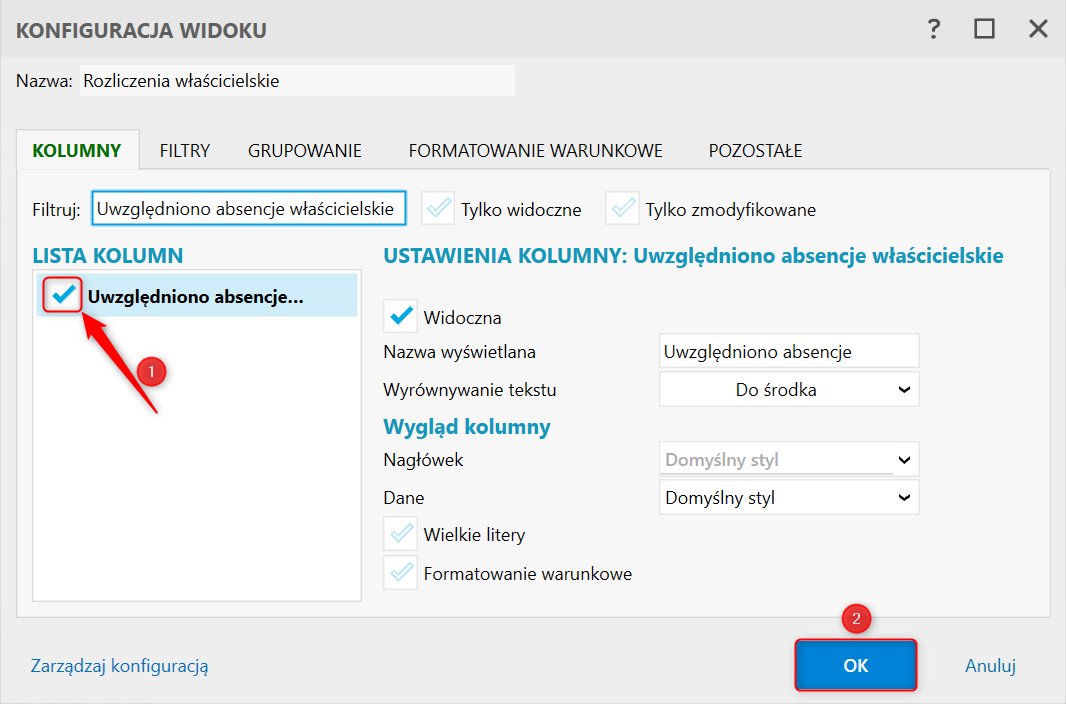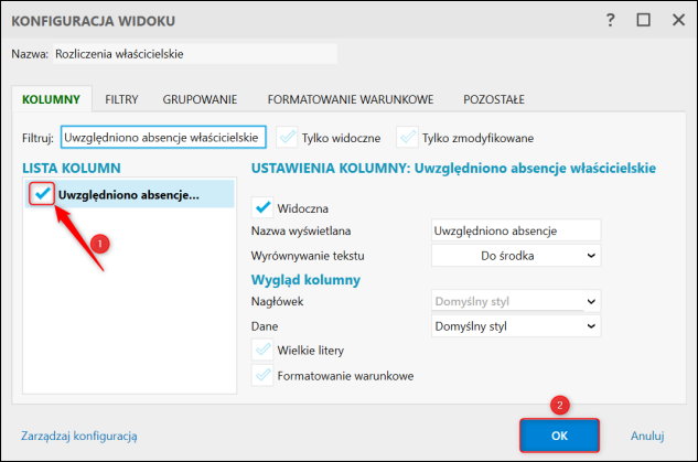 2. Odszukać i zaznaczyć kolumnę Uwzględniono absencje właścicielskie. Zatwierdzić przyciskiem OK.