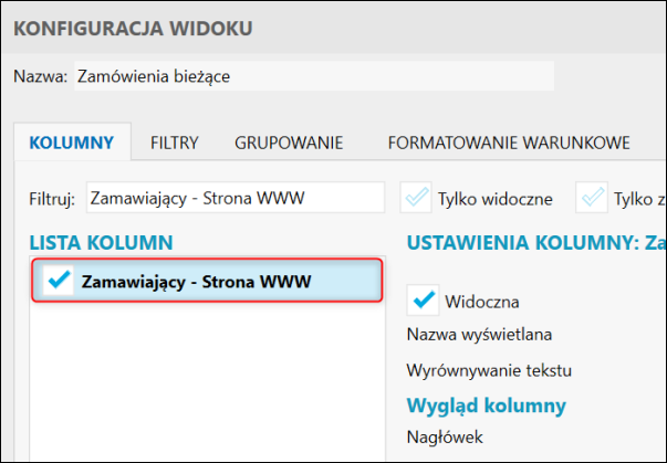 Aby pokazać kolumnę Zamawiający – Strona WWW, należy: