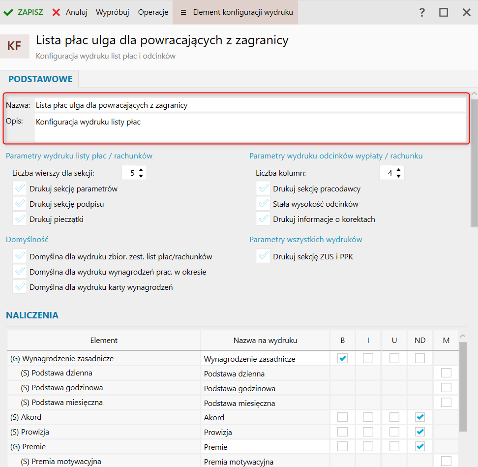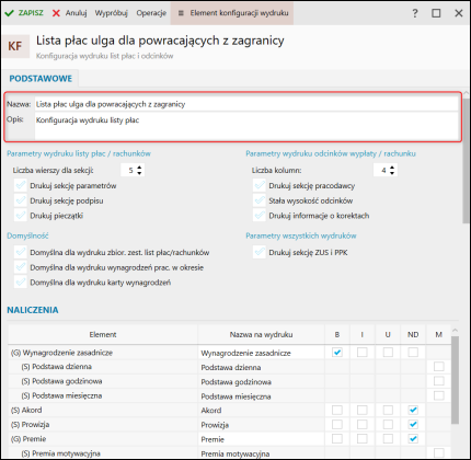 2. Uzupełnić nazwę i opis wzorca wydruku.