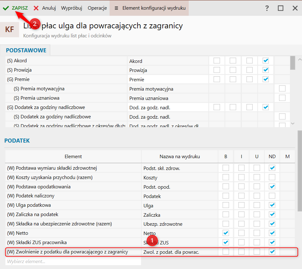 3. W dolnej sekcji formularza w sekcji Podatek dodać Element: (W) Zwolnienie z podatku dla powracających z zagranicy. Zapisać zmiany.