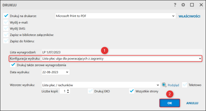 4. Podczas wydruku Listy płac wybrać wcześniej utworzony wzorzec.