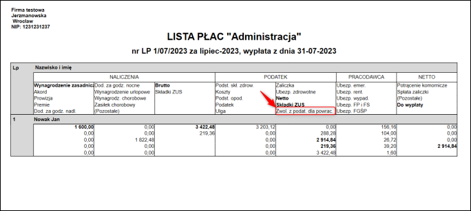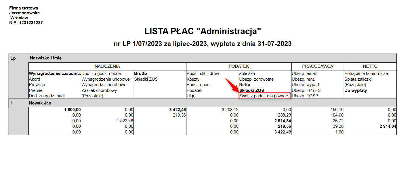 Gratyfikant nexo – Jak do wydruku listy płac dodać informację o wysokości przychodu zwolnionego z opodatkowania (ulga dla powracających z zagranicy)?