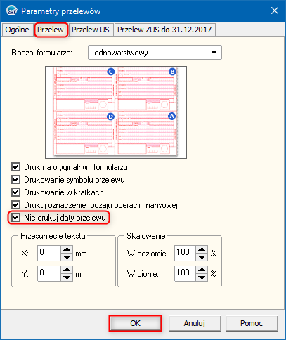 2. W oknie, które się wyświetli przejść na zakładkę Przelew i zaznaczyć opcję Nie drukuj daty przelewu. Zmiany zapisać przyciskiem OK.