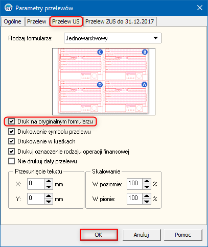 2. W oknie, które się wyświetli przejść na zakładkę Przelew US i zaznaczyć opcję Druk na oryginalnym formularzu. Zmiany zapisać przyciskiem OK.