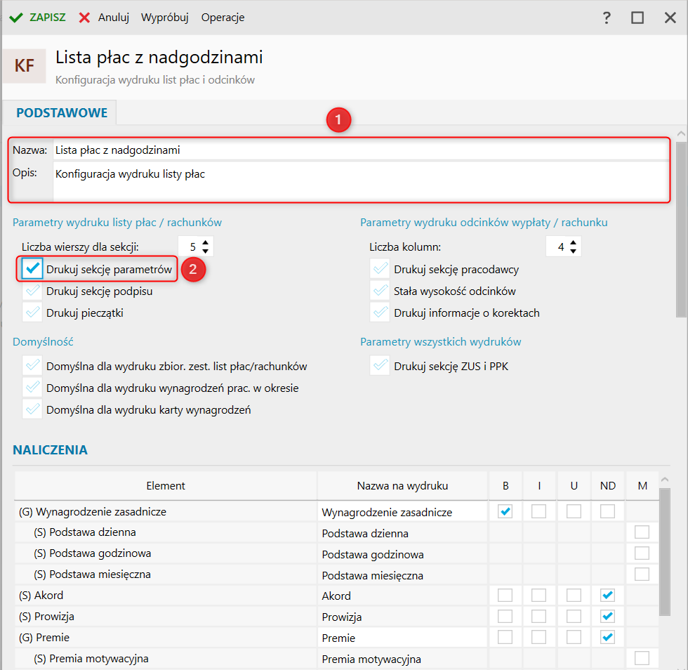 2. Uzupełnić nazwę i opis wzorca wydruku. Zaznaczyć opcję Drukuj sekcję parametrów.