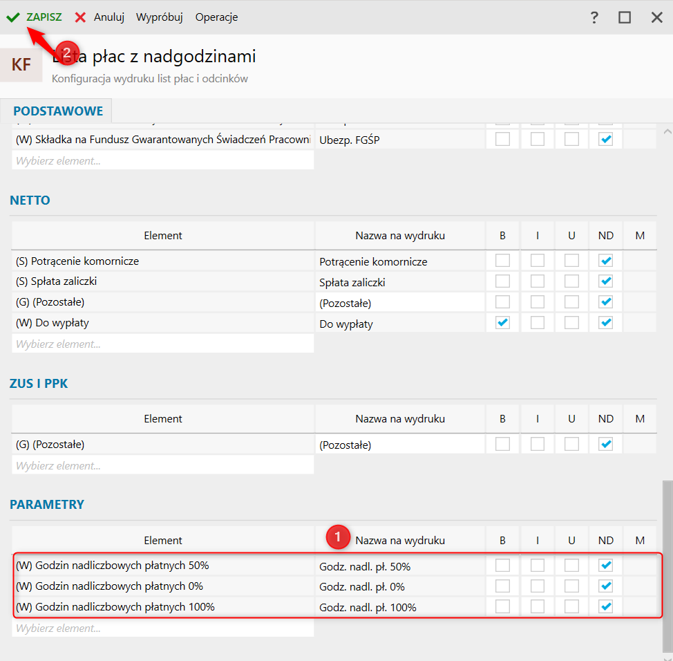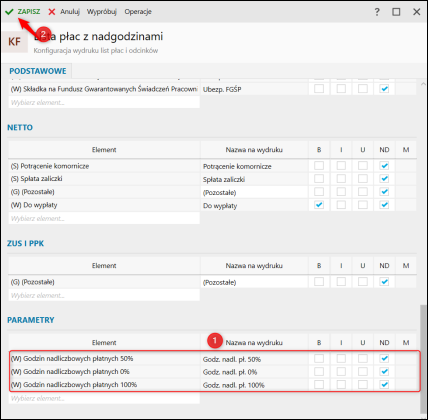 3. W dolnej sekcji formularza w sekcji Parametry dodać Element: (W) Godzin nadliczbowych płatnych 0%, 50%, 100%. Zapisać zmiany.