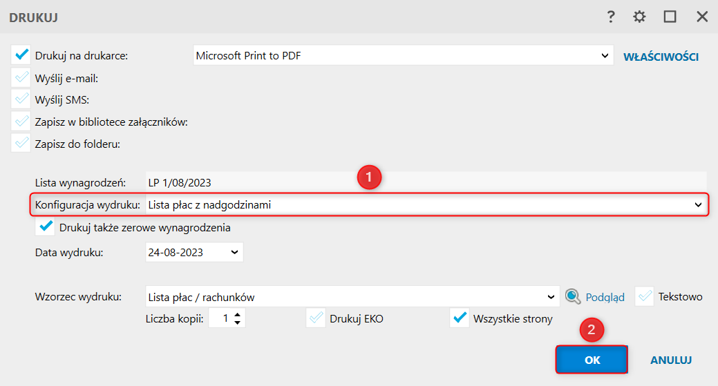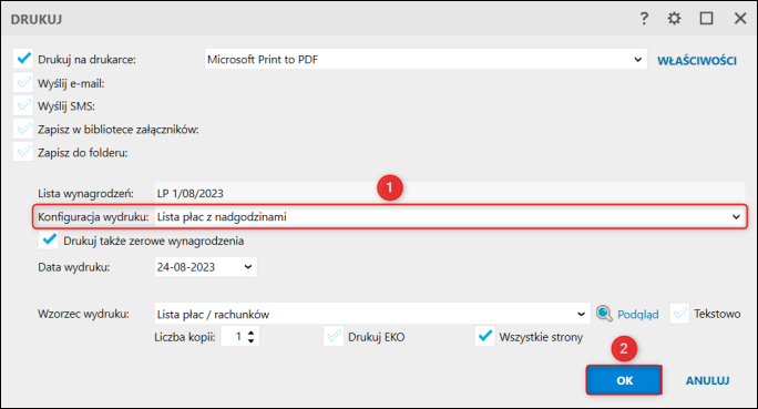 4. Podczas wydruku Listy płac wybrać wcześniej utworzony wzorzec.