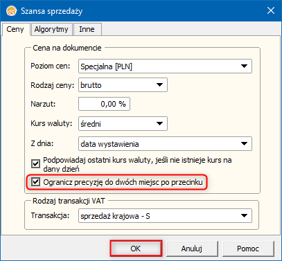 2. W oknie, które się wyświetli zaznaczyć opcję Ogranicz precyzję do dwóch miejsc po przecinku. Zmiany zapisać przyciskiem OK.
