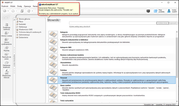 ​Za blokadę funkcjonalności w programie mikroGratyfikant GT odpowiada słownik Personel. Uprawnienia można spersonalizować dla konkretnego użytkownika. Aby zablokować użytkownikowi dostęp do parametrów w małych płacach, należy: