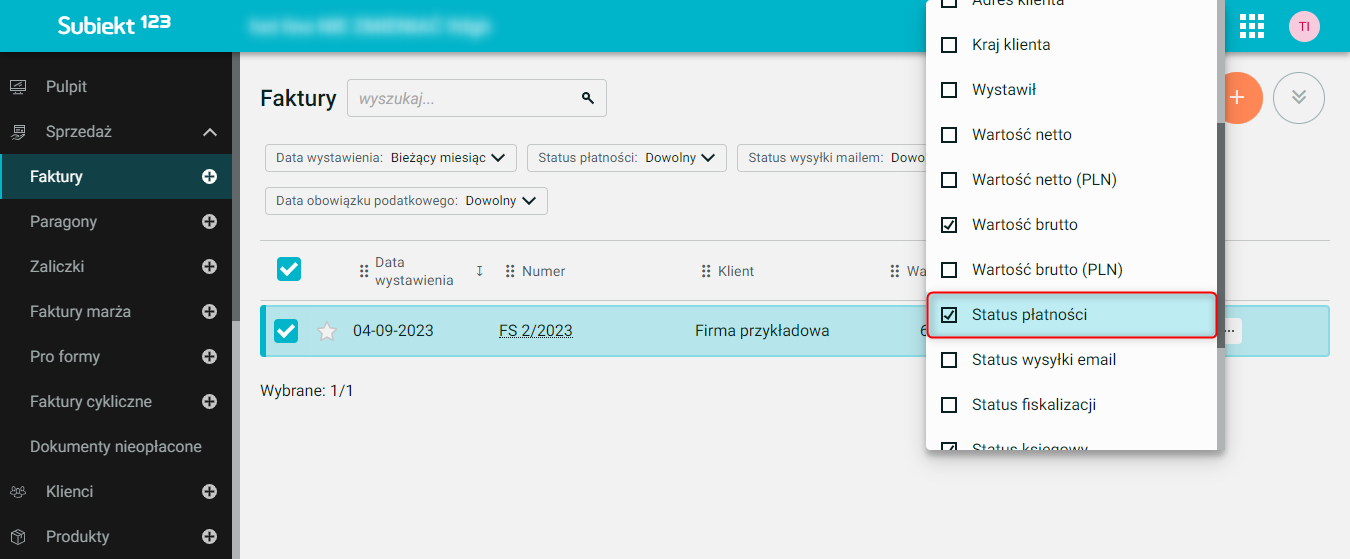 Jeżeli kolumna nie jest widoczna, należy ją aktywować, klikając nazwę dowolnej kolumny Prawym Przyciskiem Myszy, a następnie zaznaczając Status płatności.