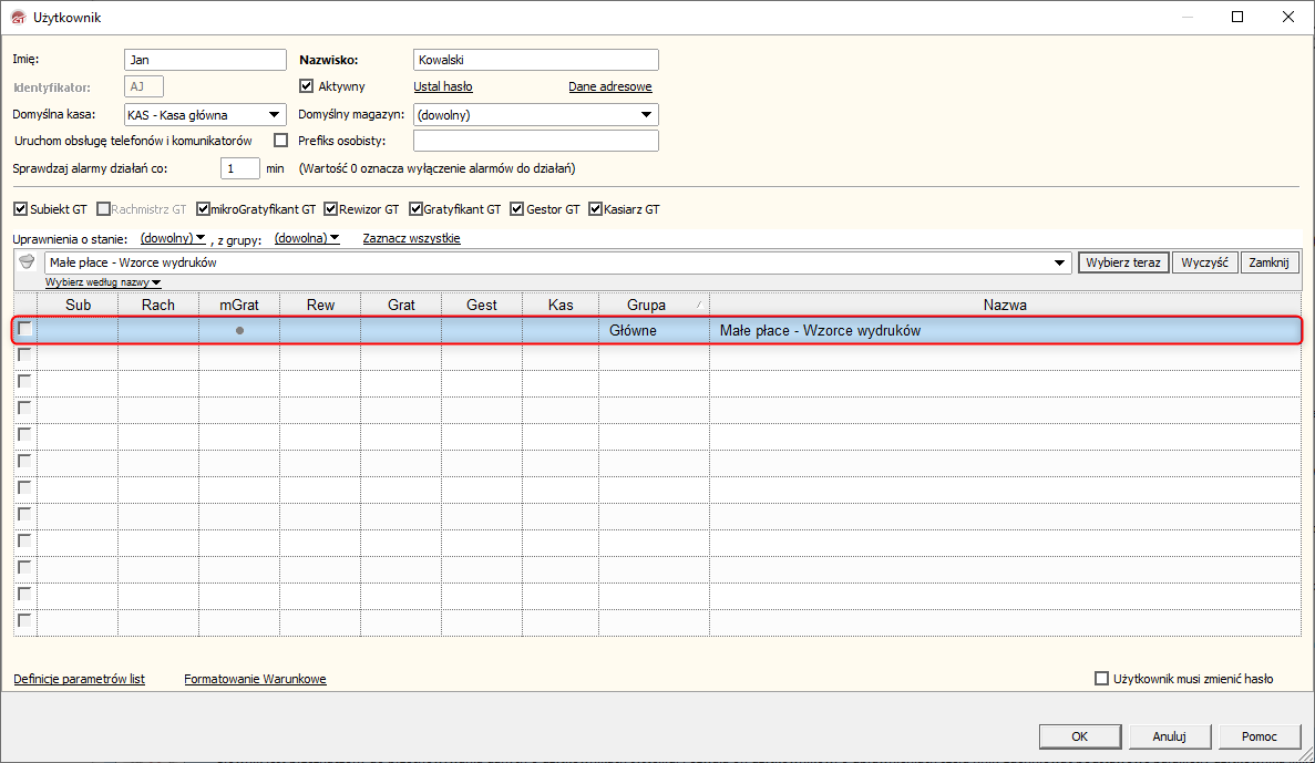 Za blokadę funkcjonalności w programie mikroGratyfikant GT odpowiada słownik Personel. Uprawnienia można spersonalizować dla konkretnego użytkownika. Aby zablokować użytkownikowi możliwość edycji wzorców wydruków w małych płacach, należy: