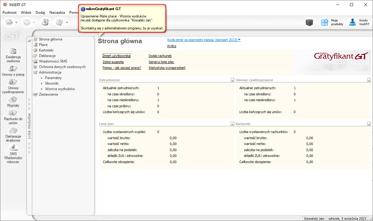 Rezultatem odebrania uprawnień będzie blokada możliwości edycji wzorców wydruków w małych płacach potwierdzona odpowiednim komunikatem.