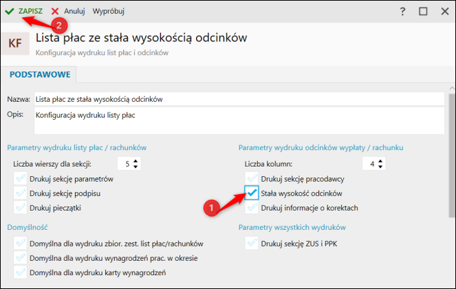 2. Uzupełnić nazwę i opis wzorca wydruku. Zaznaczyć opcję Stała wysokość odcinków. Zapisać zmiany.