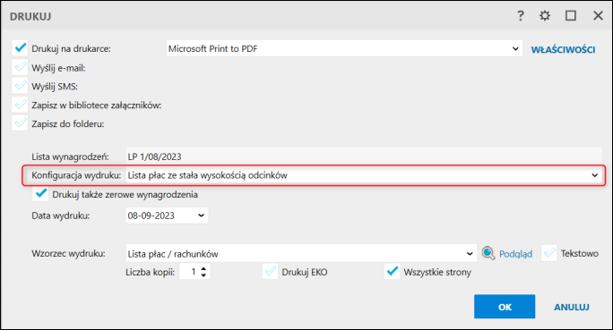 Należy pamiętać, aby podczas wydruku Listy płac wybrać wcześniej utworzony wzorzec.