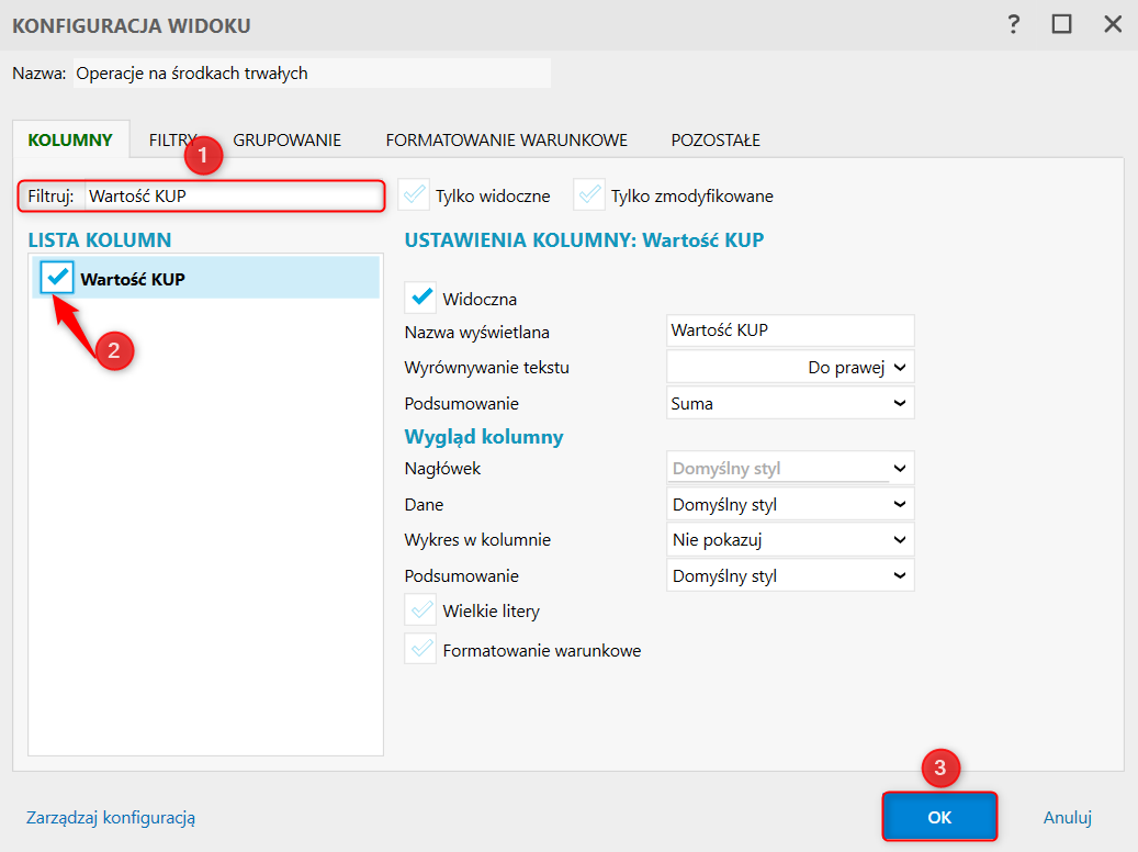 2. Odnaleźć i włączyć kolumnę Wartość KUP. Zapisać zmiany.