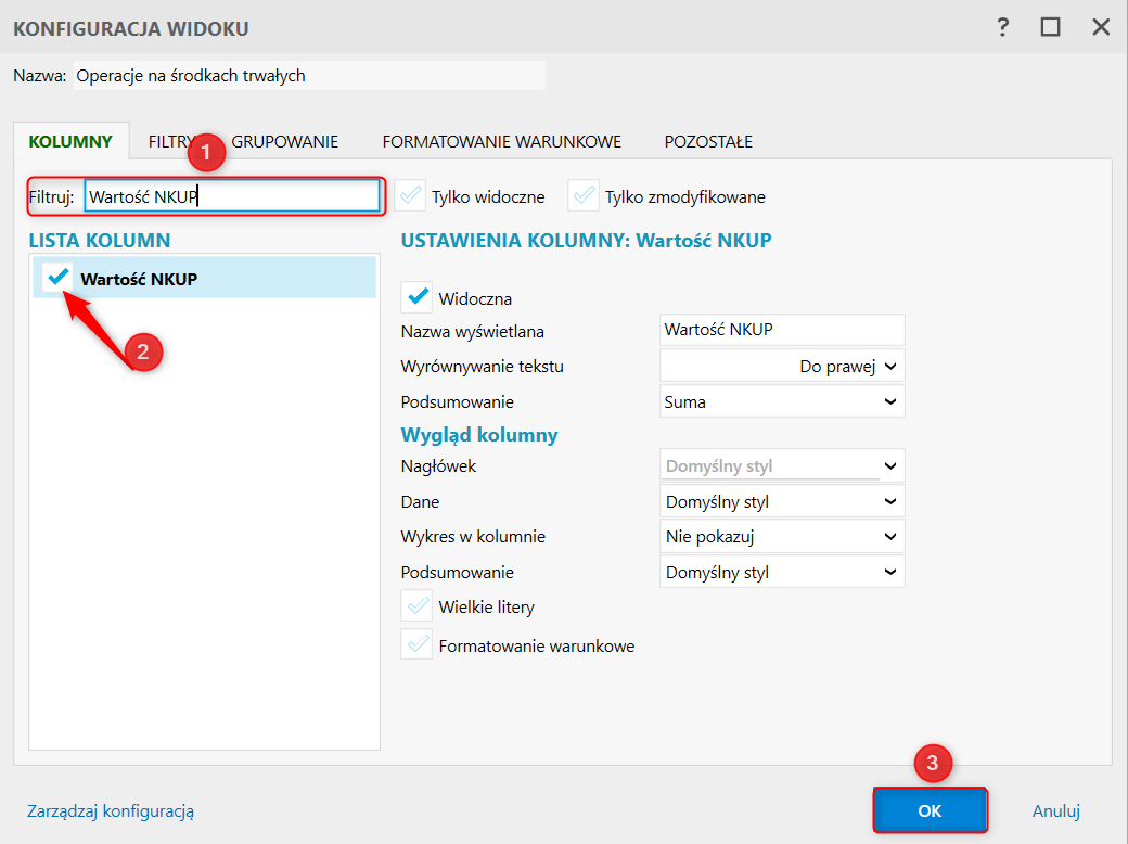 2. Odnaleźć i włączyć kolumnę Wartość NKUP. Zapisać zmiany.