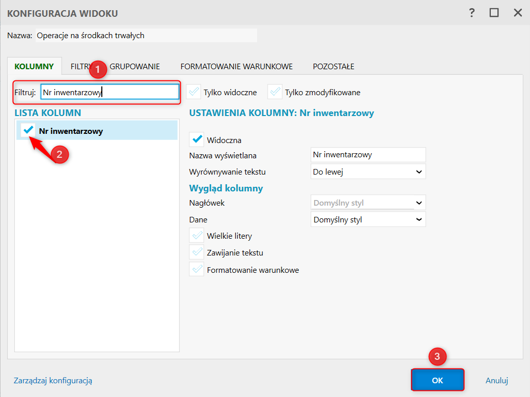 2. Odnaleźć i włączyć kolumnę Nr inwentarzowy. Zapisać zmiany.