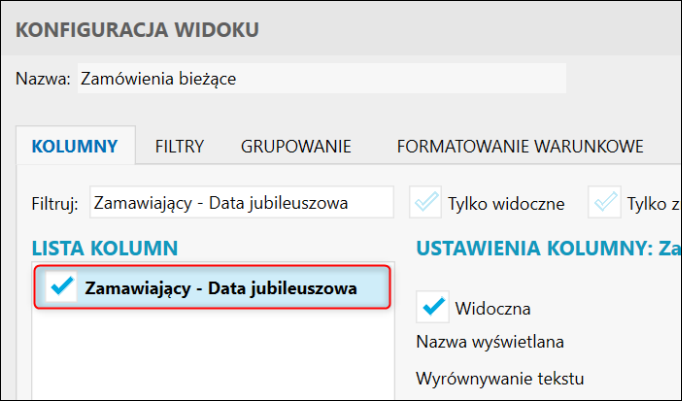 Aby pokazać kolumnę Zamawiający – Data jubileuszowa, należy:
