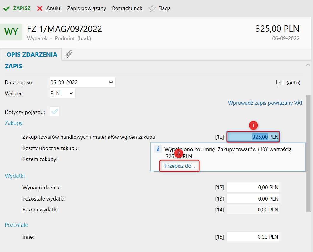 1. Kliknąć wartość wydatku i wybrać akcję Przepisz do...
