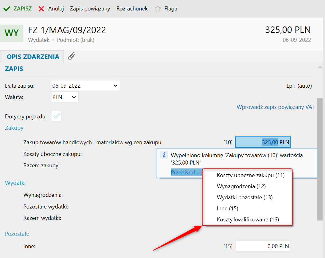 Podczas wprowadzania wydatku przez Portal Dokumentów istnieje możliwość przepisania kwoty do innej kolumny KPiR. Aby to zrobić, należy: