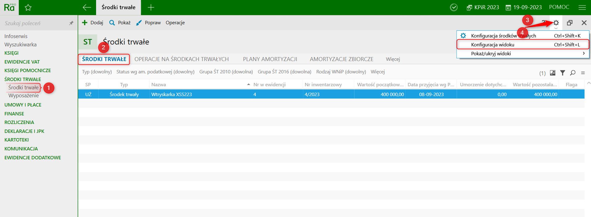 1. Przejść do modułu Środki trwałe, kliknąć „koło zębate" znajdujące się w prawym górnym rogu, następnie wybrać Konfiguracja widoku.