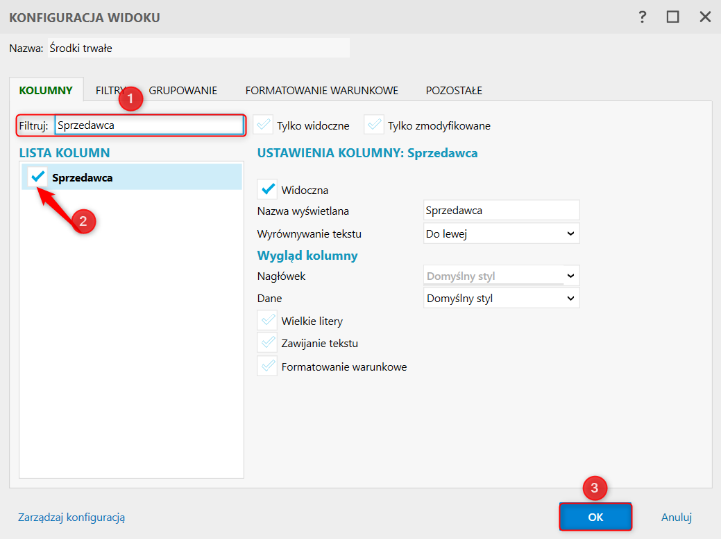2. Odnaleźć i włączyć kolumnę Sprzedawca. Zapisać zmiany.