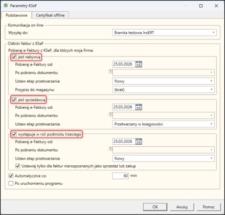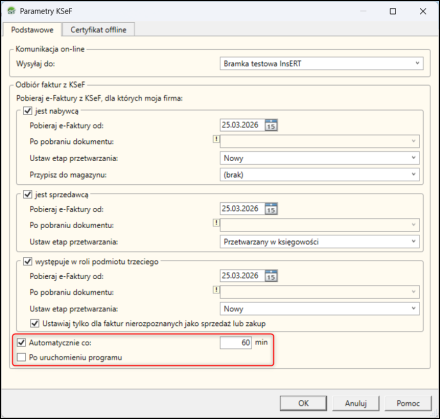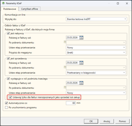 3. Wybrać faktury, które powinny być pobierane zaznaczając Pobieraj e-Faktury z KSeF, dla których moja firma: