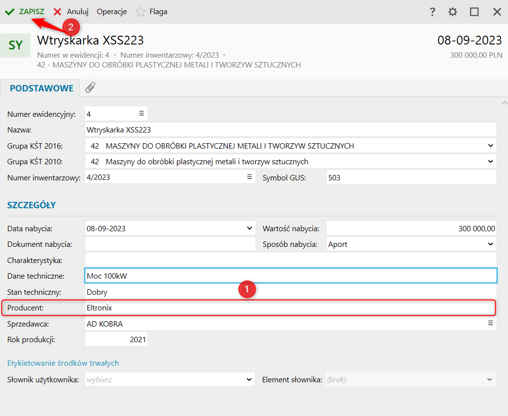 2. Uzupełnić Producenta w odpowiednim miejscu formularza środka trwałego. Zapisać zmiany.