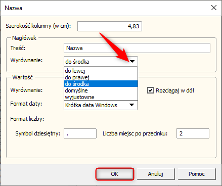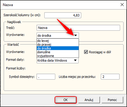 4. W sekcji Nagłówek rozwinąć listę Wyrównanie i wybrać odpowiednie ustawienie. Zmiany zatwierdzić przyciskiem OK.