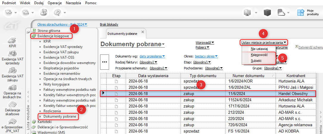 1. Z listy modułów wybrać Ewidencje księgowe – Dokumenty pobrane, zaznaczyć dokument lub wiele dokumentów, które mają mieć ustawione miejsce przetwarzania, rozwinąć opcję Ustaw miejsce przetwarzania i kliknąć Księgowość lub Subiekt.