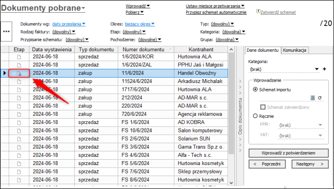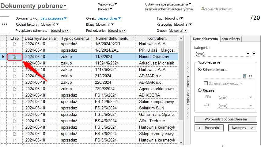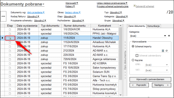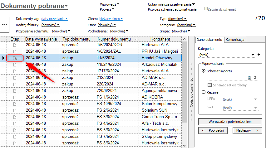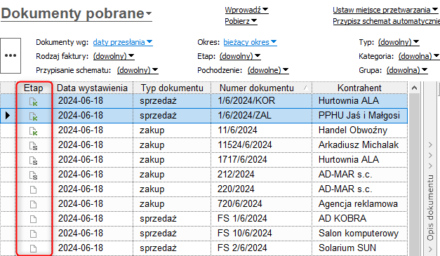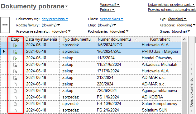 Do weryfikacji obecnego statusu dokumentu w module Dokumenty pobrane – dokumenty służy kolumna Etap przetwarzania dokumentu.