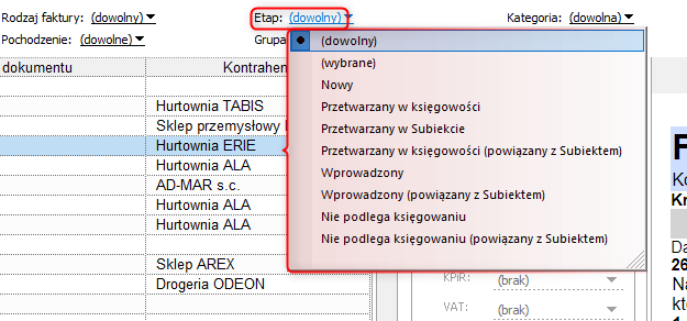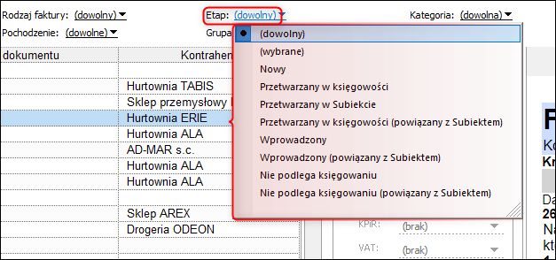 Do filtrowania dokumentów po ich statusie służy filtr Etap.
