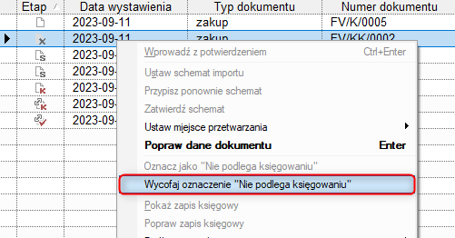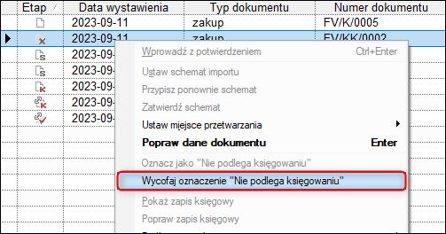 W celu wycofania oznaczenia Nie podlega księgowaniu, należy  zaznaczyć dokumenty, które są oznaczone jako Nie podlega księgowaniu, a następnie kliknąć zaznaczenie Prawym Przyciskiem Myszy i wybrać opcję Wycofaj oznaczenie "Nie podlega księgowaniu"