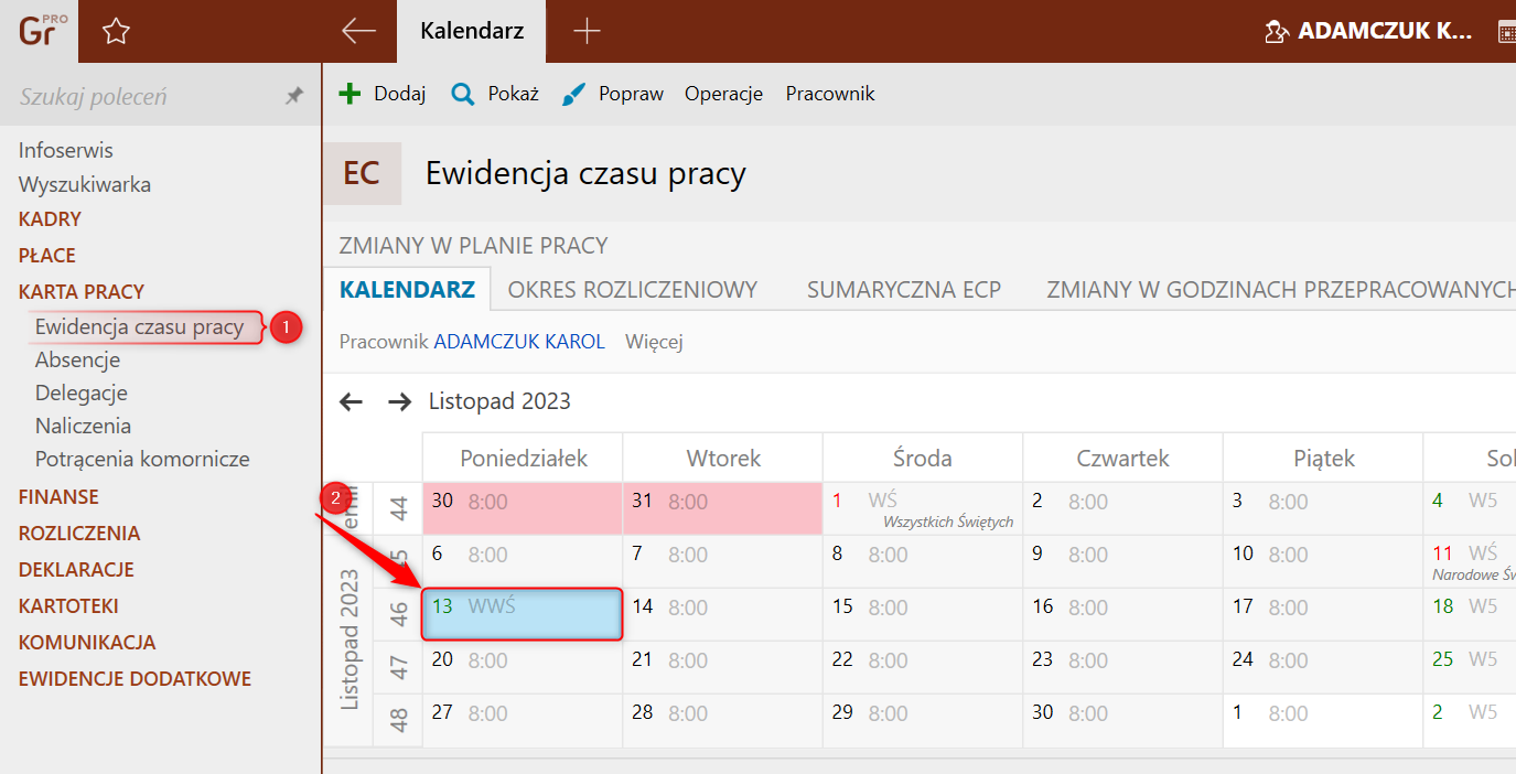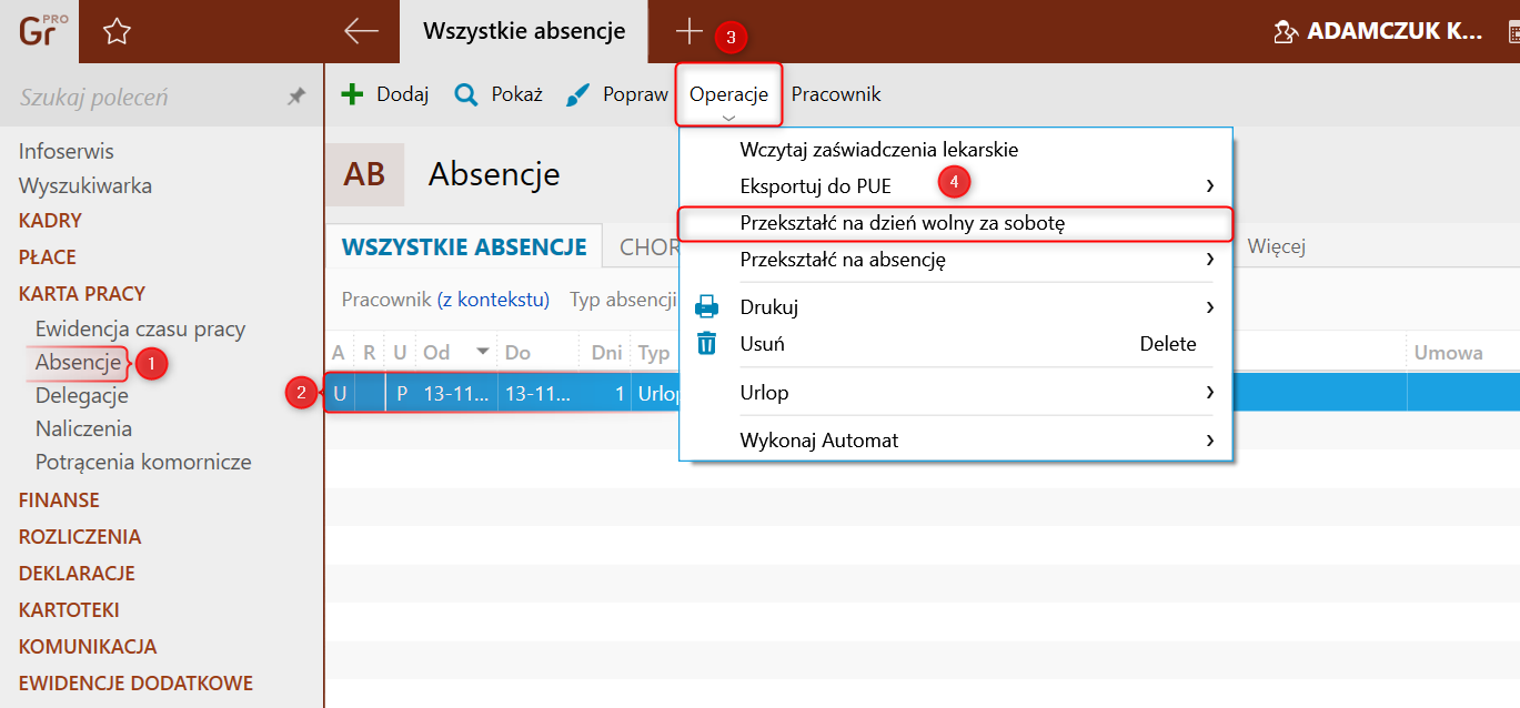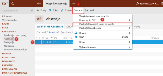 1. Przejść do modułu Absencje, zaznaczyć pozycję na liście, a następnie wybrać Operacje – Przekształć na dzień wolny za sobotę.
