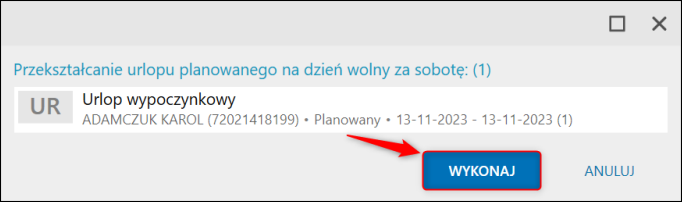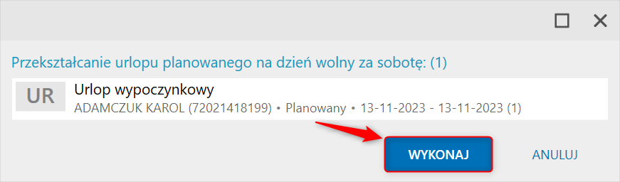 Uwaga! Operacja jest możliwa wyłącznie dla jednodniowych absencji o typie Urlop wypoczynkowy lub Urlop wypoczynkowy na żądanie o statusie Planowany.
