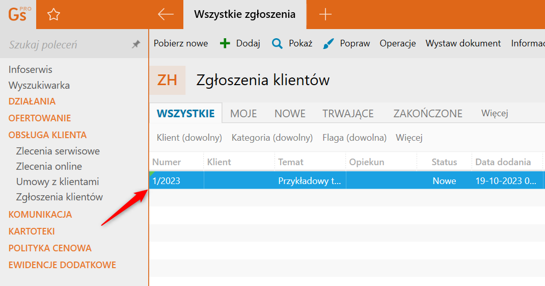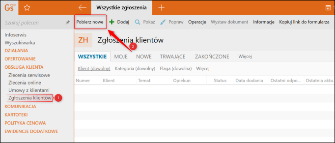 W sytuacji, gdy np. po dodaniu nowych zgłoszeń klientów zajdzie konieczność powrotu do kopii zapasowej utworzonej przed ich dodaniem, brakujące zgłoszenia mogą zostać pobrane z serwera ręcznie. Aby to zrobić, należy​ przejść do modułu Zgłoszenia klientów i kliknąć Pobierz nowe​.