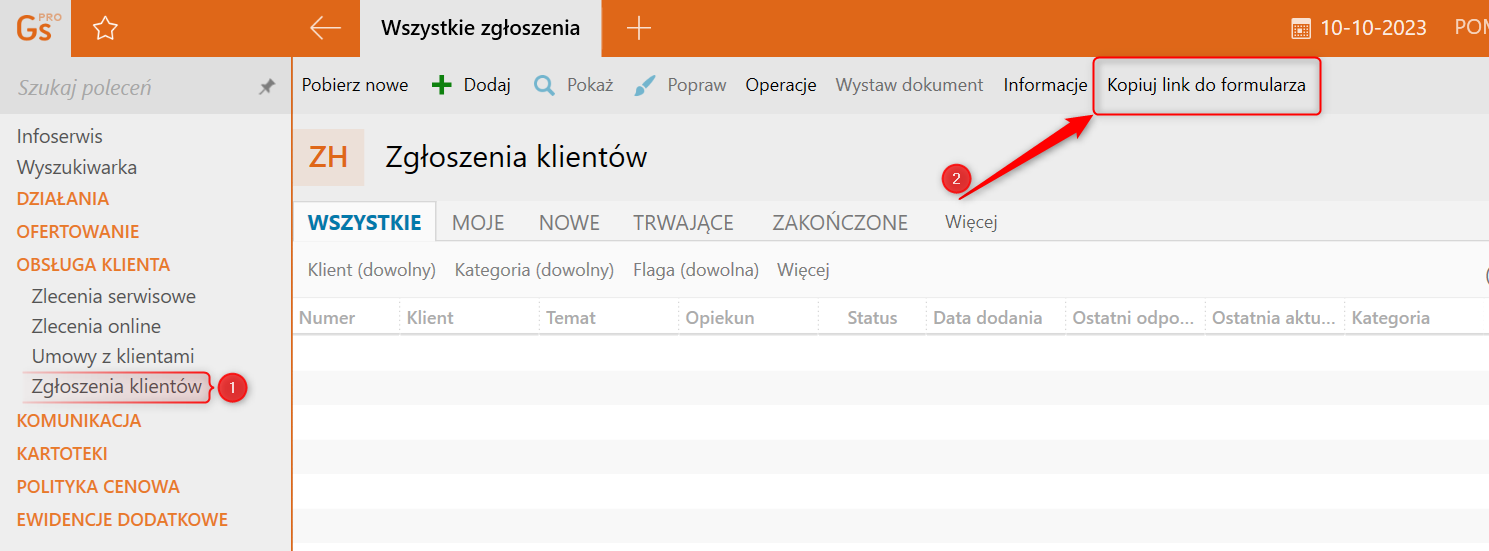 Aby skopiować link do formularza w celu udostępnienia go klientom, należy przejść do modułu Zgłoszenia klientów i kliknąć Kopiuj link do formularza.