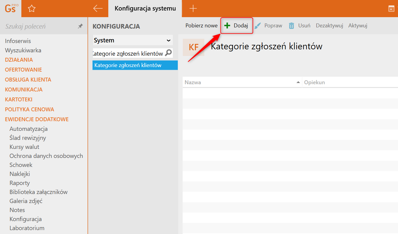 Aby dodać nową kategorię zgłoszeń klientów, należy: