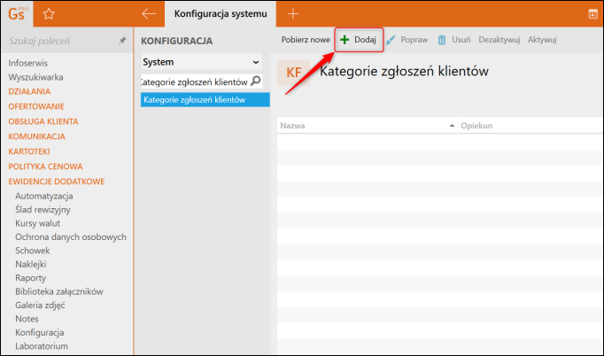 1. Przejść do Konfiguracji – Kategorie zgłoszeń klientów, a następnie kliknąć Dodaj.