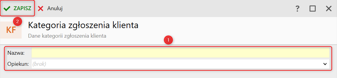2. Określić Nazwę kategorii i opcjonalnie przypisać do niej wybranego opiekuna. Zatwierdzić przyciskiem Zapisz.